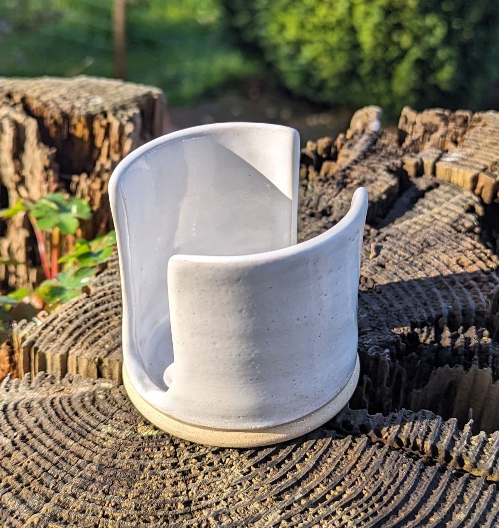 These are thrown on the wheel and allowed to dry a little, then the slots for the sponge were carefully cut out. After drying I then apply the glaze, and then fired to approx 1180deg c